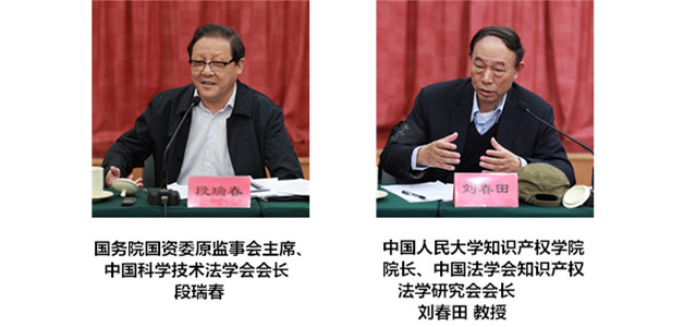 国务院国资委原监事会主席、中国科学技术法学会会长段瑞春,中国人民大学知识产权学院院长、中国法学会知识产权法学研究会会长刘春田教授共同主持了研讨会。